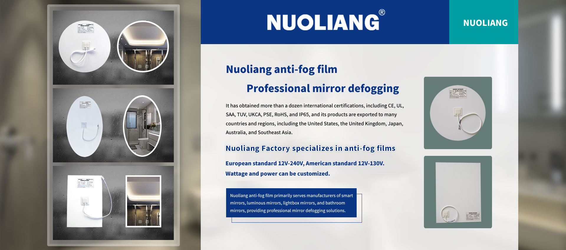 Suzhou NUOLIANG Electronic Technology Co., Ltd., located in Taicang City, Jiangsu Province, adjacent to Shanghai, is a professional enterprise specializing in the research, development, production, and sales of anti-fog film. With over 19 years of experience in the anti-fog film industry, the company boasts more than 20 production lines. NUOLIANG anti-fog film has passed SGS and UL factory audits and obtained international quality certifications including CE, UL, TUV, SAA, US, PSE, RoHS, REACH, IP54, and IP65. NUOLIANG products are selected by numerous smart mirror and lightbox mirror manufacturers both domestically and internationally, and are exported to Europe, America, Australia, Asia, and other countries.
