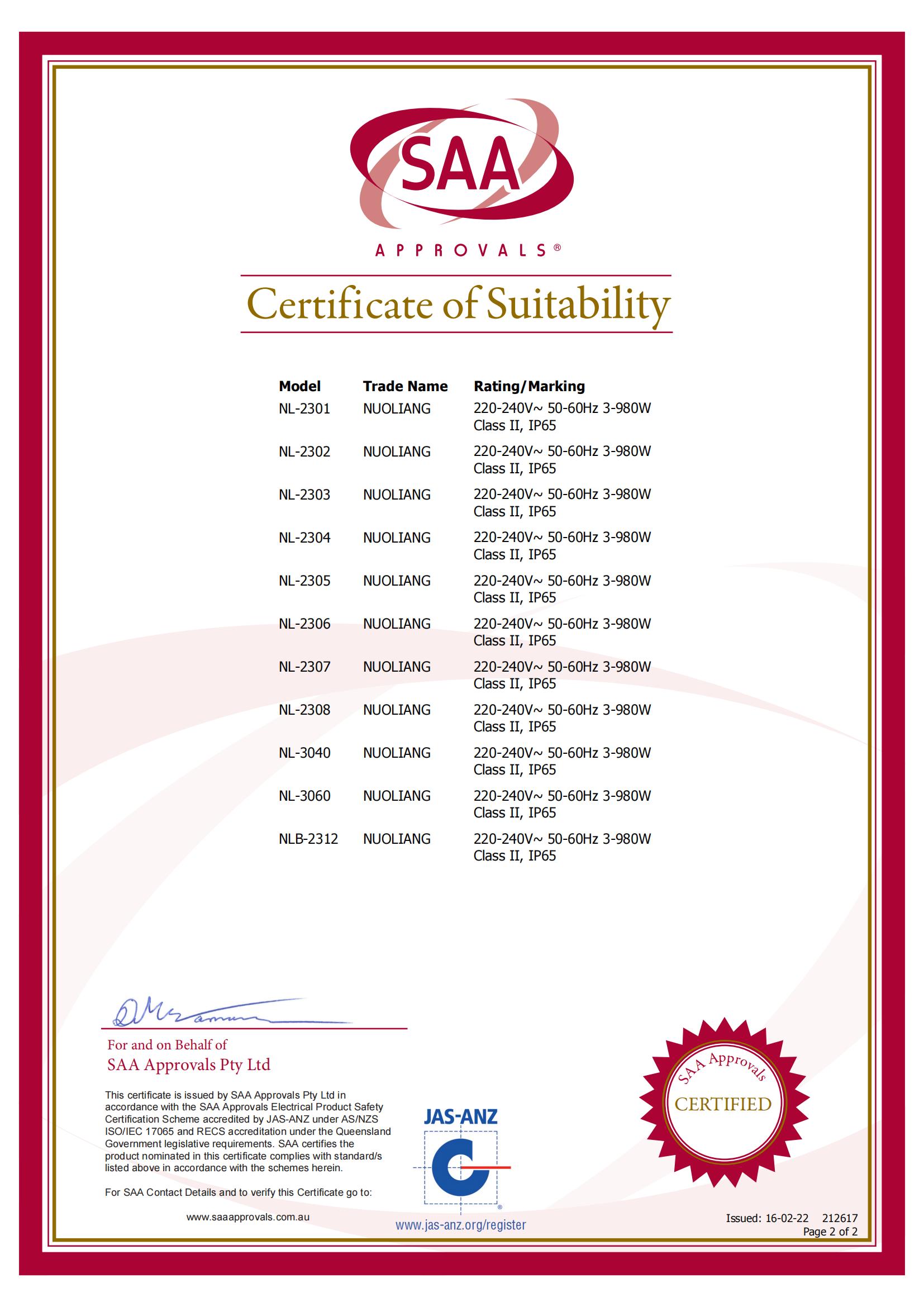 NUOLIANG updated its SAA certificate on February 16, 2022.